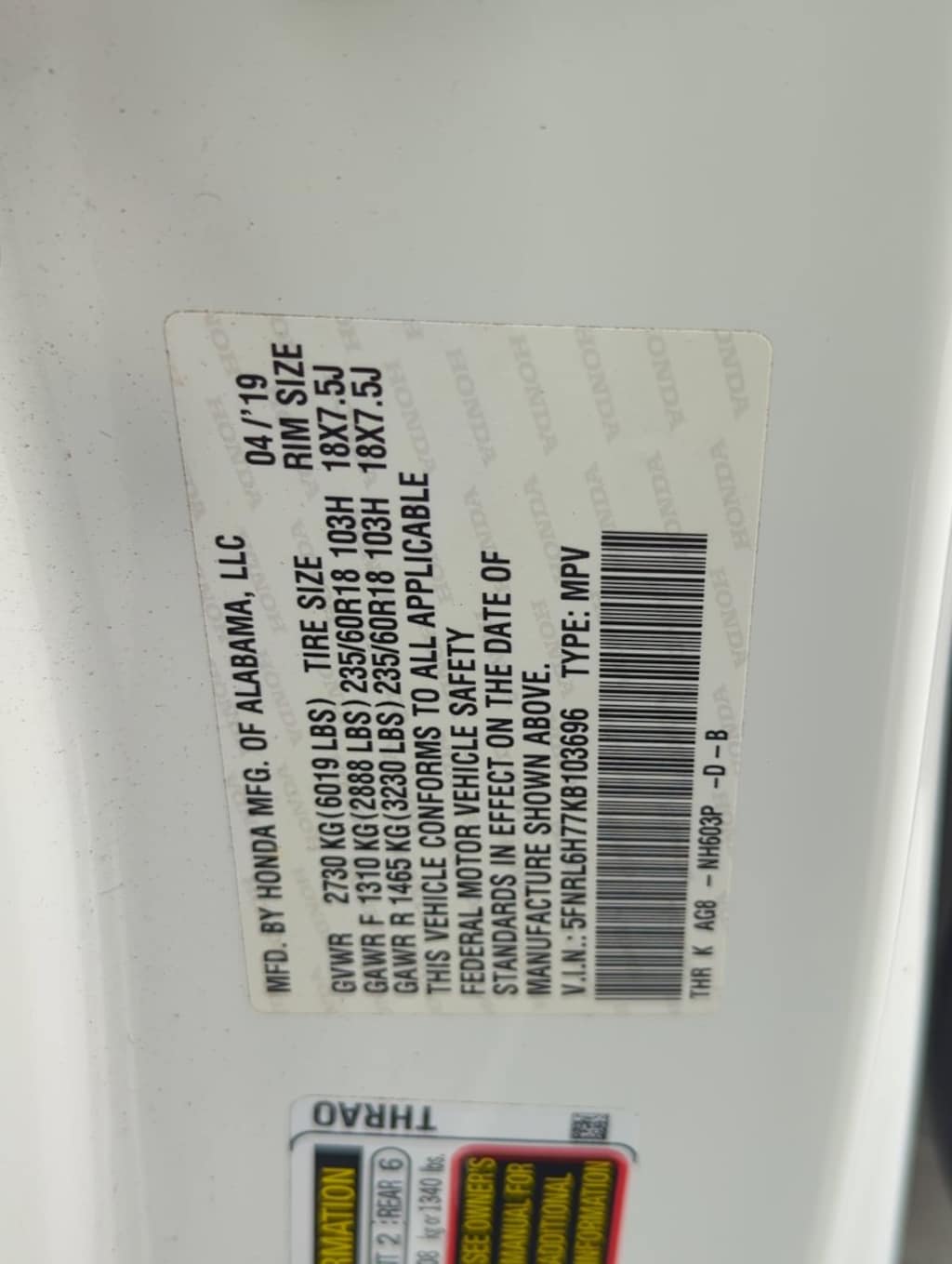 5FNRL6H77KB103696